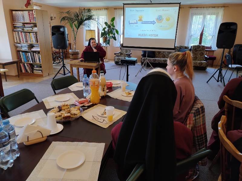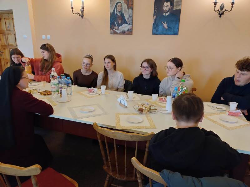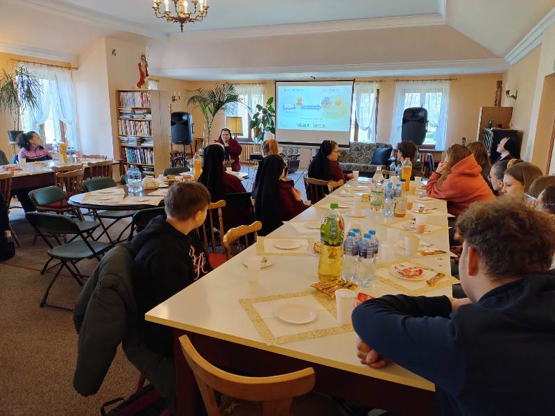 Po mszy zaprosiłyśmy wszystkich do naszej sali wspólnej, na drobny poczęstunek, chwilę rozmowy przy stole, gdzie mogłyśmy choć trochę poznać tych uzdolnionych młodych ludzi, a później siostra Magda opowiedziała o nas i naszym życiu, z pomocą specjalnie przygotowanej prezentacji. Zaczęła od tegorocznego tematu Fundacji: „Uczeń – misjonarz”, czyli jak przejść od bycia uczniem, który zdobywa wiedzę, do dzielenia się tą wiedzą z innymi.